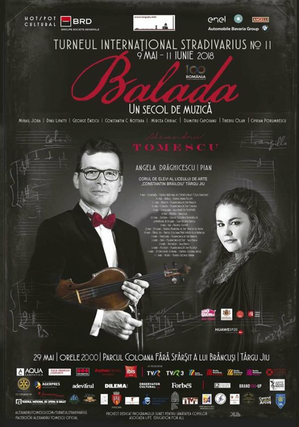 Potrivit viceprimarului municipiului Târgu-Jiu, Adrian Tudor, intrarea la acest concert va fi liberă, în limita a 1.000 de locuri. “Este pentru a treia oară când violonistul Alexandru Tomescu vine la Târgu- Jiu, în cadrul unui Turneu Stradivarius. Costurile evenimentului sunt suportate de către sponsorii turneului, iar noi, din bugetul local, asigurăm amplasarea scenei şi sonorizarea. Este pentru prima dată când balada lui Ciprian Porumbescu va fi cântată vocal de corul de elevi ai Liceului de Arte <> Târgu-Jiu. Concertul este dedicat de altfel manifestărilor organizate cu ocazia Centenarului Marii Uniri fiind intitulat sugestiv <<Balada, un secol de muzică>>. Organizatorii evenimentului sunt Primăria şi Consiliul Local al Municipiului Târgu-Jiu, în colaborare cu Şcoala Populară de Artă Târgu-Jiu, Liceul de Arte <> şi Clubul Rotary Târgu-Jiu”, a declarat Adrian Tudor. Alături de violonistul Alexandru Tomescu, în Parcul Coloanei Fără Sfârşit va fi prezentă şi pianista Angela Drăghicescu. Ediţia cu numărul XI a Turneului Internaţional Stradivarius este dedicată Centenarului Marii Uniri. “Centenarul Marii Uniri este o oportunitate de a ne aminti şi celebra cele mai importante şi valoroase momente ale naţiunii noastre, iar Turneul Internaţional Stradivarius 2018, ca brand cultural naţional, îşi doreşte să prezinte cele mai valoroase şi inspirate creaţii ale muzicii clasice româneşti, creaţii care trăiesc peste timp şi inspiră generaţii de muzicieni la nivel mondial. Proiectul muzical românesc dedicat Centenarului Marii Uniri are ca obiectiv susţinerea unei serii de concerte de muzică clasică în 15 oraşe din România, precum şi în străinătate, susţinute de violonistul Alexandru Tomescu cu vioara Stradivarius Elder-Voicu, obiect de Patrimoniu Naţional, Categoria Tezaur şi pianista de origine română stabilită în USA, Angela Drăghicescu, cărora li se alătură Coruri de Copii din Programul Cantus Mund, iniţiat de Corul Madrigal şi Corul de Copii Radio, abordând un repertoriu de muzică românească aparţinând compozitorilor români George Enescu, Ciprian Porumbescu, Dinu Lipatti, Tiberiu Olah etc., în scopul promovării identităţii naţionale”, se arată în comunicatul emis de către reprezentanţii Direcţiei Turism şi Evenimente Culturale şi Centrul Naţional de Informare şi Promovare Turistică “Constantin Brâncuşi” din Târgu-Jiu.