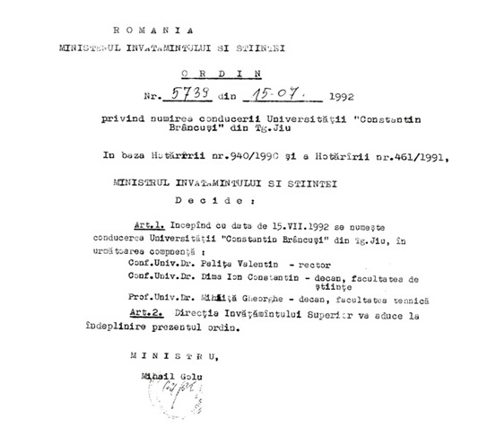 Apoi, prin Ordinul Ministrului Învățământului și Științei nr 5739/1992, începând cu data de 15 iulie 1992 la Universitatea “Constantin Brâncuși” din Târgu Jiu se numește conducerea acesteia în următoarea componență: