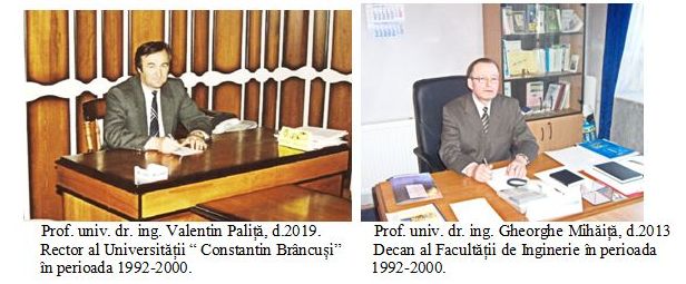 Așadar, conf. univ. dr. ing. Valentin Paliță a fost primul rector al Universității “Constantin Brîncuși”, iar prof.univ. dr. ing. Mihăiță Gheorghe a fost primul decan al Facultății de Inginerie. Conf. univ. dr. Constantin Ion Dima a fost primul decan al Facultății de științe, unde intrau științele economice și științele juridice.