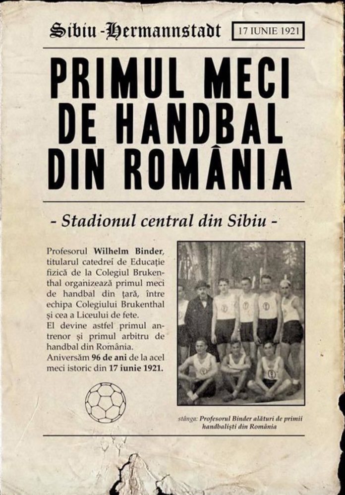 Federația Română de Handbal a anunțat că toate competițiile ce se vor desfășura în acest an vor sta sub egida ,,100 de ani de handbal în România”. Joi, 17 iunie, s-a împlinit un secol de la primul meci de handbal disputat la Sibiu, în 1921. ,,Handbalul a adus foarte multă bucurie oamenilor din această țară, continuă să aducă bucurie, este privit și iubit și, în cazul unei performanțe mari, ar putea să scoată oamenii în stradă. Văd handbalul ca pe un copac cu foarte multe ramuri și cu rădăcini adânci, atât în sportul românesc, cât și în contemporaneitatea românească”, a declarat președintele de la FRH, Alexandru Dedu. Cu prilejul serbărilor de sfârşit de an şcolar, în 17 iunie 1921, pe stadionul central din Sibiu, a avut loc un joc demonstrativ de handbal între elevii profesorului Wilhelm Binder, care a oficiat meciul şi în calitate de arbitru. Atestarea oficială scrisă confirmă şi primul antrenor, dar şi primul arbitru de handbal din România, profesorul Wilhelm Binder, titularul catedrei de educaţie fizică de la Liceul Brukenthal din Sibiu, ai cărui elevi sunt deci şi primii jucători de handbal din România. Primul meci de handbal din ţară s-a jucat între echipa Liceului Brukenthal şi cea a Liceului de fete.