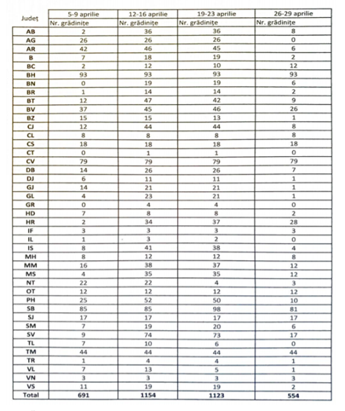 Grădinițele pot organiza activități cu copiii și în perioada vacanței de primăvară, cu avizul direcțiilor de sănătate publică. Potrivit unei situații publicate de Ministerul Educației, la nivelul județul nostru, în această primă săptămână a vacanței de primăvara sunt deschise 14 grădinițe. În perioada 12-23 aprilie vor funcționa 21 de grădinițe, iar în perioada 26-29 aprilie va funcționa o singură grădiniță.