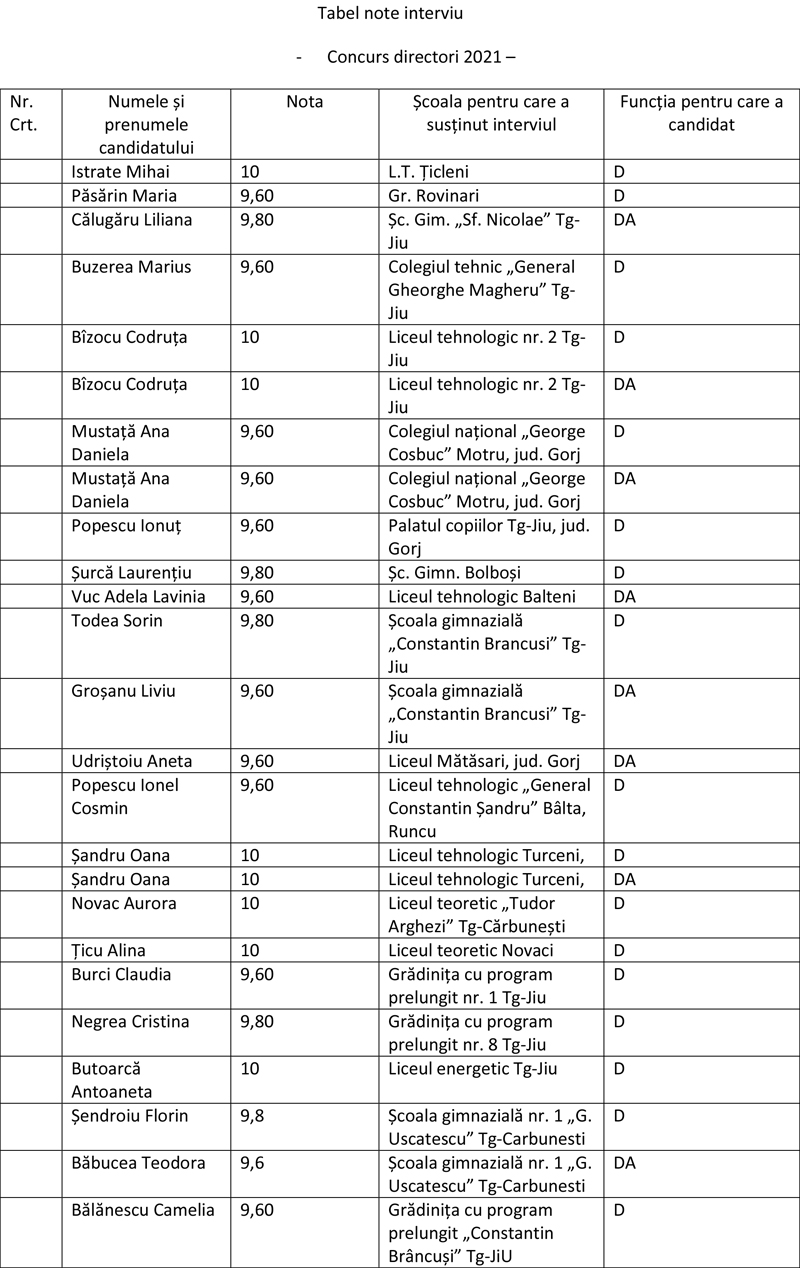 Istrate Mihai, de la Liceul Tehnologic Țicleni, a obținut nota zece la proba de interviu și postul de director al unității pentru încă patru ani. Doi de zece a primit la interviu, și pentru postul de director și pentru cel de adjunct, Codruța Bîzocu de la Liceul Tehnologic nr.2 din Târgu-Jiu. Șandru Oana de la Liceul Turceni, Novac Aurora, de la Liceul Teoretic Târgu