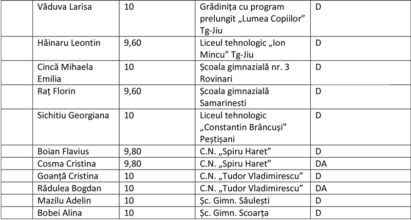 Bogdan, de la CNTV Târgu Jiu, Mazilu Adelin, de la Școală Gimnazială Săulești, dar si Bobei Alina, de la Școala Gimnazială Scoarța. De menționat, sunt și note de 9.60-9.80, obținute de candidații la posturile de conducere de la școli și grădinițe, rezultatele fiind necesare pentru promovarea pe funcțiile de conducere.