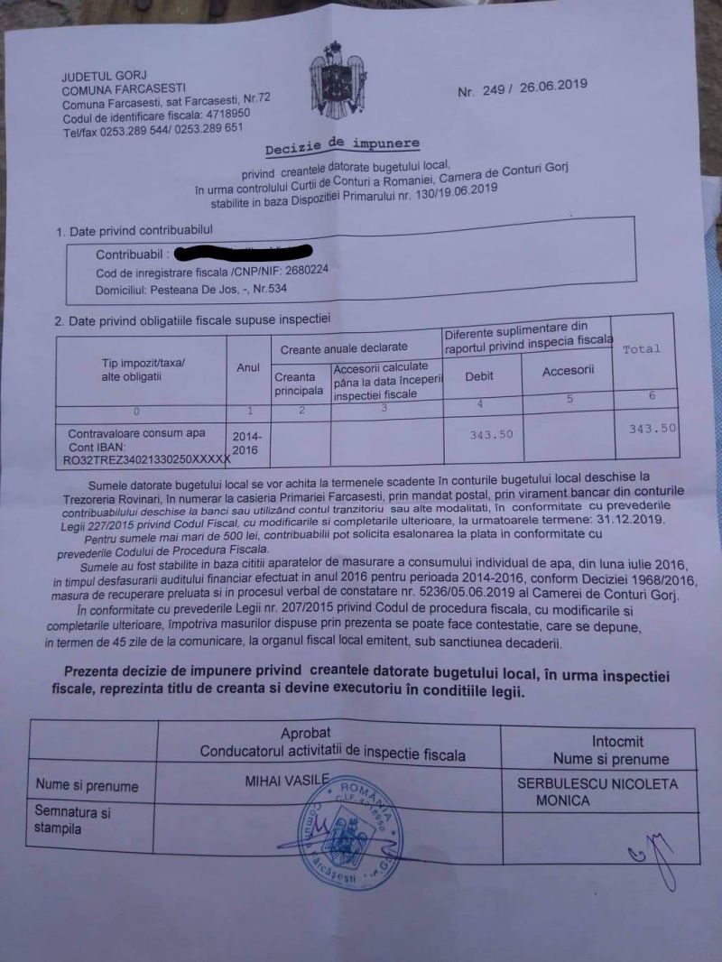 1500 de proprietari din Fărcășești, somați să-și achite apa nepotabilă consumată în perioada 2014-2016! Localnicii, gata de protest