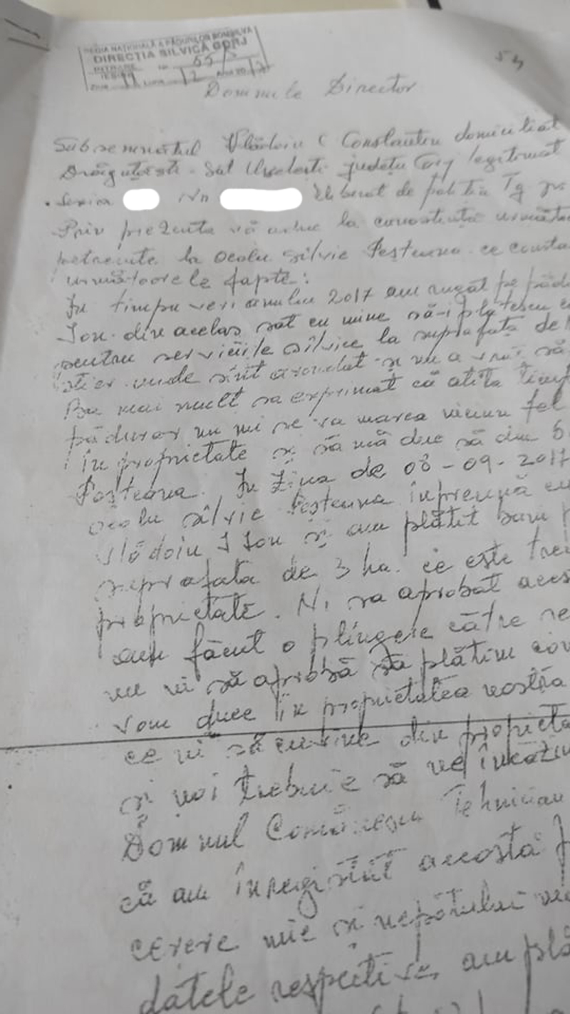 Omul depune astfel o plângere în care povestește cele întâmplate, dar anexează și chitanțe ale plății pazei pădurii sale (2014-2019).