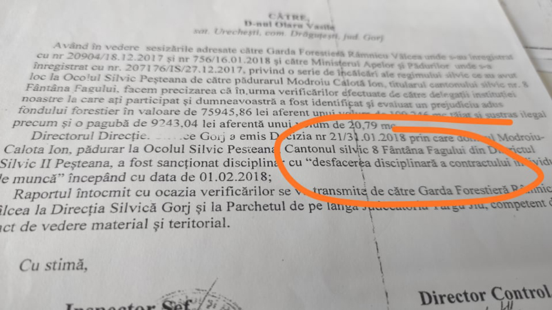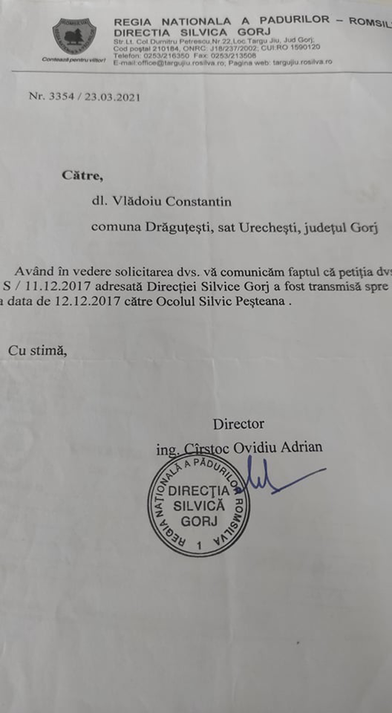 Omul spune că situația ar fi stat altfel dacă pădurarul Modroiu, la momentul tăierii lemnului, i-ar fi dat aviz pentru expediția cantității, lucru care nu s-a întâmplat. Constantin Vlădoiu s-a adresat, în scris, senatorului Cristi Rujan, iar parlamentarul de Gorj a transmis solicitarea pensionarului către Romsilva, așteptând un răspuns legat de măsurile luate în acest caz.