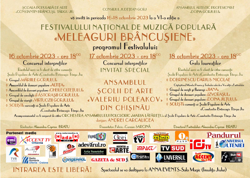 Folclorul românesc va fi la el acasă la Târgu-Jiu, în perioada 16-18 octombrie, când Școala Populară de Arte va organiza cea de-a șasea ediție a Festivalului Național de Muzică Populară ,,Meleaguri Brâncușiene”. Activitățile programate pentru cele trei seri cultural-artistice se vor desfășura la restaurantul de pe Insulița Jiului.