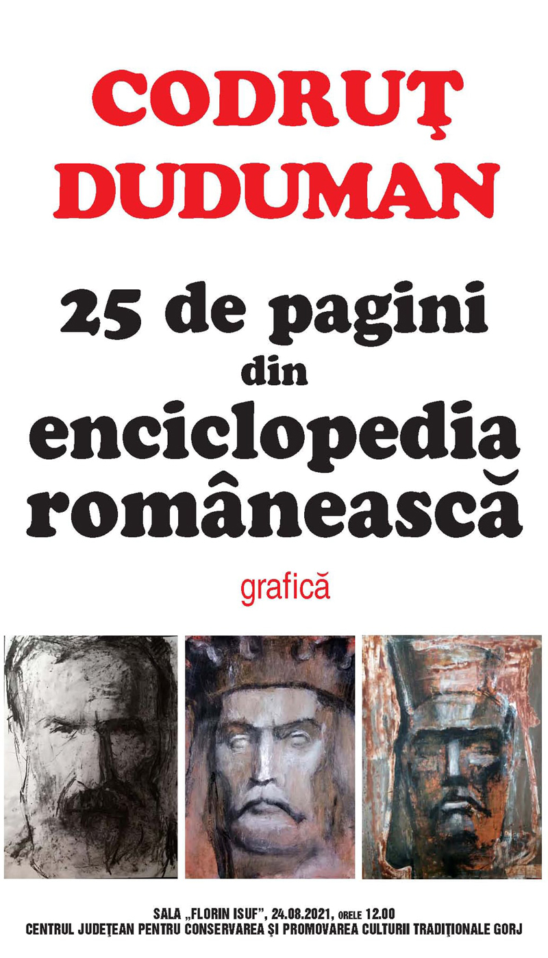 Astăzi, de la ora 12.00, la sediul Centrului Județean pentru Conservarea și Promovarea Culturii Tradiționale Gorj va avea loc vernisajul expoziției de grafică „25 de pagini din enciclopedia românească”, semnată de artistul băcăuan Codruț Duduman.