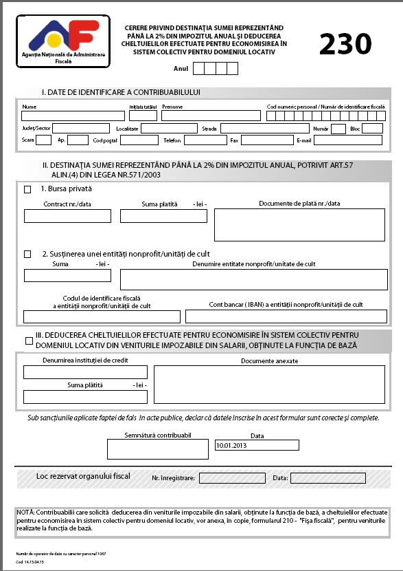 Contribuabilii gorjeni, care vor să redirecționeze până la 2% din impozitul anual pe veniturile din salarii și asimilate salariilor şi/sau din pensii au termen limită data de 25 mai pentru depunerea formularului 230 „Cerere privind destinaţia sumei reprezentând până la 2% din impozitul anual pe veniturile din salarii şi din pensii”. Formularul se completează şi se depune de către persoanele fizice care realizează venituri din salarii şi asimilate salariilor şi/sau venituri din pensii, în următoarele situaţii: a) au efectuat în anul de raportare cheltuieli pentru acordarea de burse private conform Legii nr.376/2004 privind bursele private, cu modificările ulterioare, şi solicită restituirea acestora; b) optează pentru virarea unei sume reprezentând până la 2% din impozitul anual, pentru susţinerea entităţilor nonprofit care se înfiinţează şi funcţionează în condiţiile legii sau unităţilor de cult.
