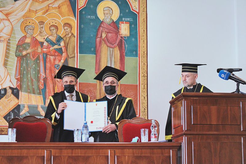 În continuare, Dl. Prof. univ. dr. ing. Leonardo Geo Mănescu, preşedintele Senatului Universităţii din Craiova, i-a decernat Pr. Prof. univ. dr. Ștefan Buchiu titlul de Doctor Honoris Causa. Părintele Decan Ştefan Buchiu a mulţumit IPS Părinte Mitropolit pentru preţuirea arătată, Universităţii din Craiova şi Facultăţii de Teologie pentru primirea acestei distincţii. Discursul sfinţiei sale a evidenţiat legătura dintre „Cunoaşterea catafatică şi Cunoaşterea apofatică”.
