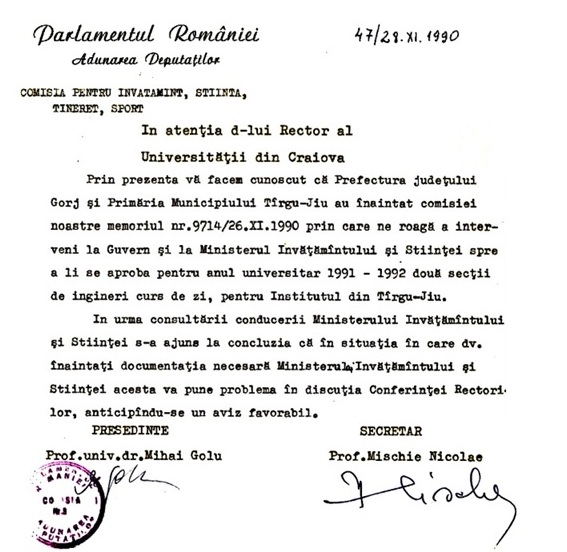 Ca dovadă, cei doi, în numele Comisiei pentru Învățământ, Știință, Tineret, Sport din Adunarea Deputaților, transmit următoarea adresă, cu numărul de înregistrare 47/28.11.1990, rectorului Universității din Craiova: