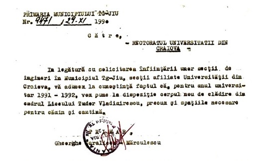 Pentru că timpul era presant, în data de 29.11.1990 Primăria Municipiului Târgu Jiu transmite Universității din Craiova adresa cu nr. 9471, semnată de Primar, Caralicea Gheorghe Mărculescu, prin care anunță universitatea craioveană că pentru anul universitar 1991-1992 pune la dispoziție corpul nou de clădire din Liceul “Tudor Vladimirescu”, precum și spațiile necesare pentru cămin și cantină.