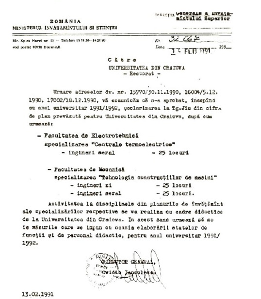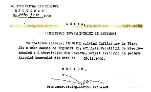 Urmare acestei adrese, Universitatea din Craiova transmite către Ministerul Învățământului și Științei adresa nr.15.770/30.11.1990 semnată de rectorul universității, prof. univ. dr. ing. Mircea Ivănescu.