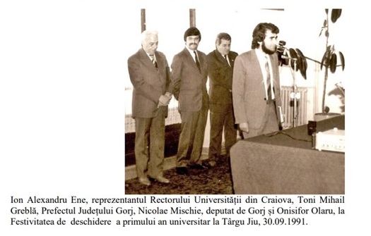 Participăm azi la un eveniment important din viața culturală și științifică a municipiului Târgu Jiu și a județului Gorj și anume deschiderea oficială, pentru prima oară, a cursurilor învățământului superior zi și seral cu durata de 5 respectiv, 6 ani. Tradiția învățământului superior la Târgu Jiu este mai veche. În 1992, aproape se împlinesc 20 de ani, aici au funcționat cursurile serale de subingineri cu o durată de 4 ani și anume, cursurile Centrale termoelectrice și Utilaje pentru industria materialelor de construcții care au dat an de an absolvenți și încă mai dau cadre necesare unităților industriale din zonă. La acestea se adaugă acum și noile secții de ingineri care vin să pregătească absolvenții liceelor din județ și din zonele învecinate, care astfel nu mai sunt nevoiți să bată la porțile diferitelor facultăți din țară. Deci baza materială a existat și există, însă ea trebuie completată cu noi dotări în așa fel ca laboratoarele să fie capabile să pregătească ingineri competitivi pe plan național și chiar internațional. Dragi studenți, există aici un corp profesional competent, cu o foarte bună pregătire științifică. Pregătirea dumneavoastră va fi ridicată la un nivel corespunzător pentru ca aceste secții să se impună pe plan național și internațional pentru că de aceasta depinde existența dumneavoastră pe plan național și internațional. În numele domnului Rector și al Biroului Colegiului Universității din Craiova, declar deschise cursurile noului an universitar al noilor secții de ingineri de la Târgu Jiu, dorindu-vă multă sănătate și numai succese în noul an universitar”