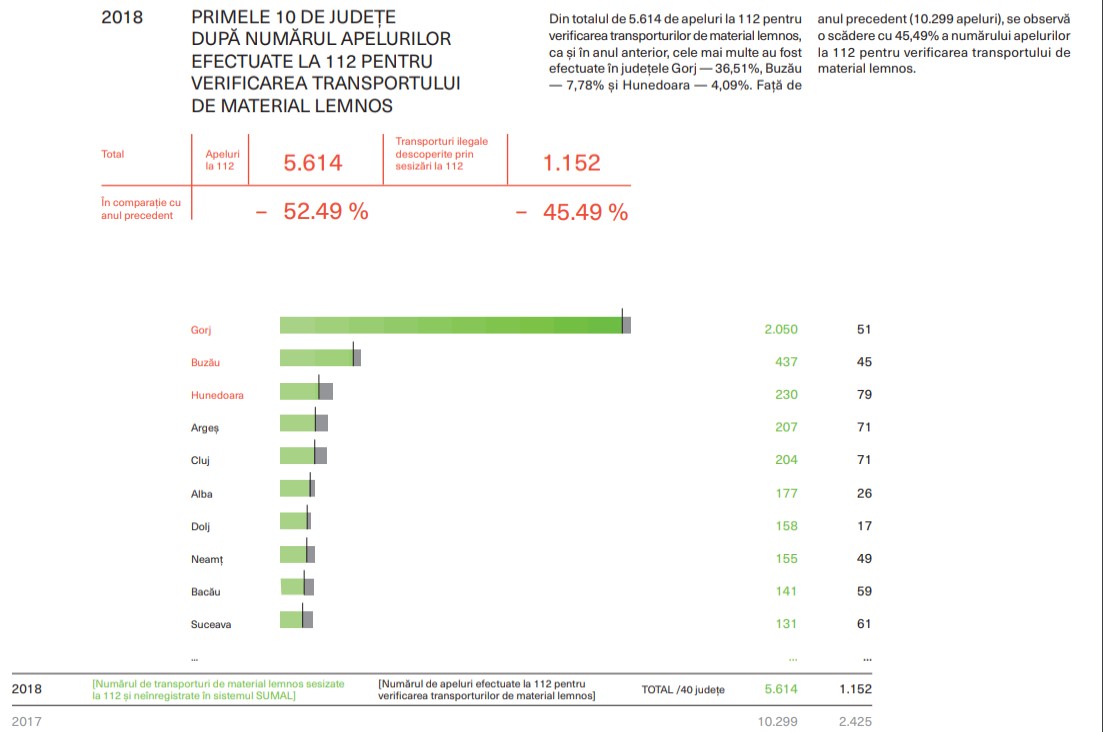Gorjul ocupă, însă, primul loc în privința numărului de apeluri la 112 pentru verificarea transporturilor de material lemnos.