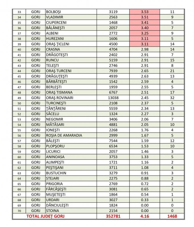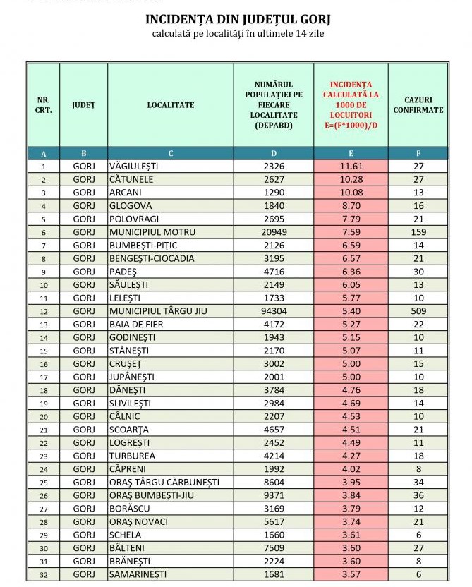 Rata de infectare în județul Gorj este de 4,22, nu mai puțin de 37 de localități aflându-se în scenariul roșu.  Cea mai mare incidență este la Văgiulești și Arcani, peste 10 cazuri la mia de locuitori.