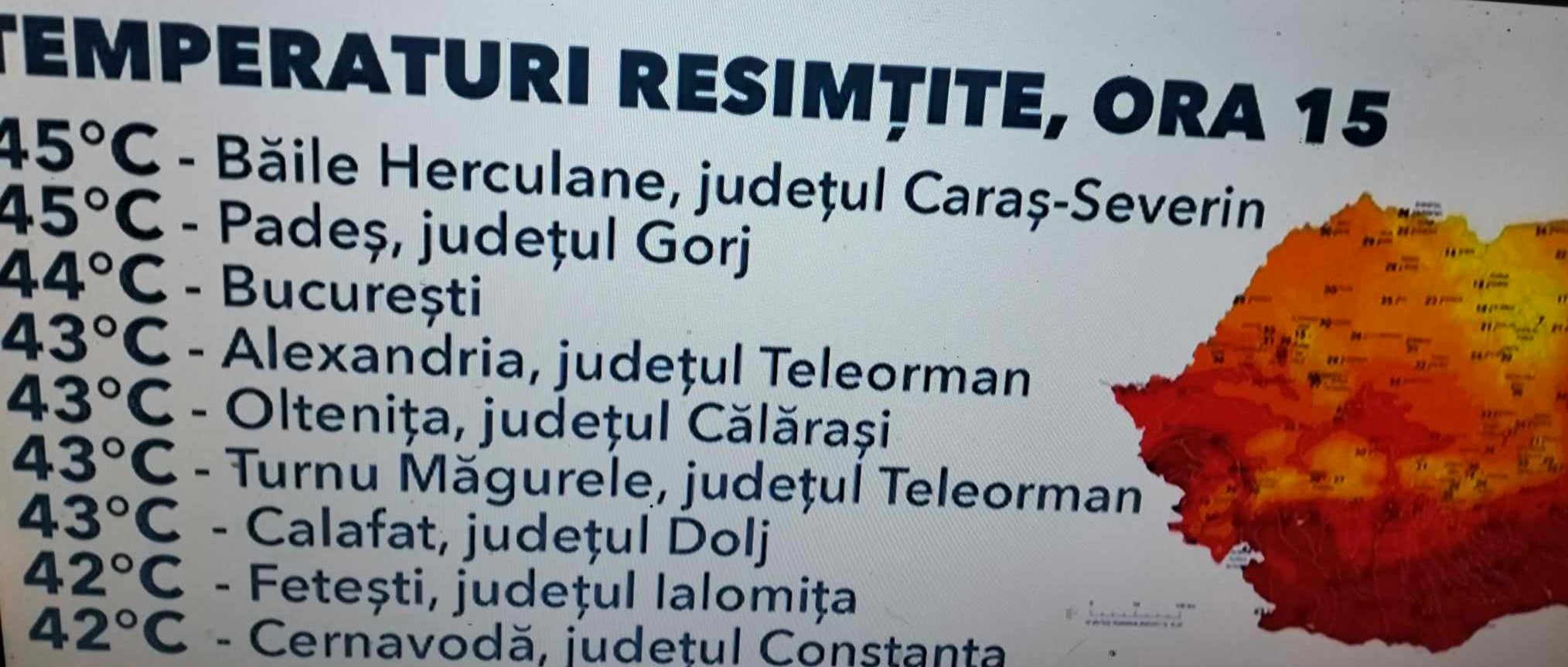 Temperaturi de 45 de grade au fost resimțite în mai multe zone ale țării, au anunțat meteorologii la televiziunile centrale. În Gorj, această temperatură s-a simțit la Padeș.