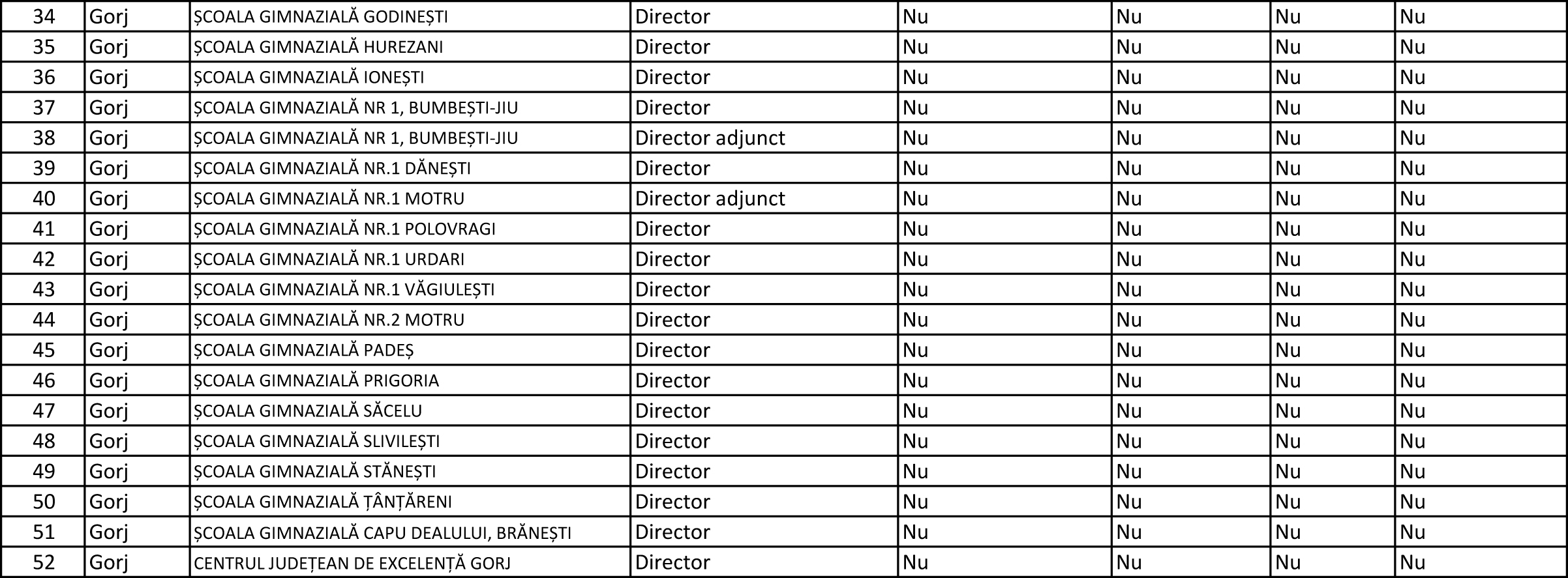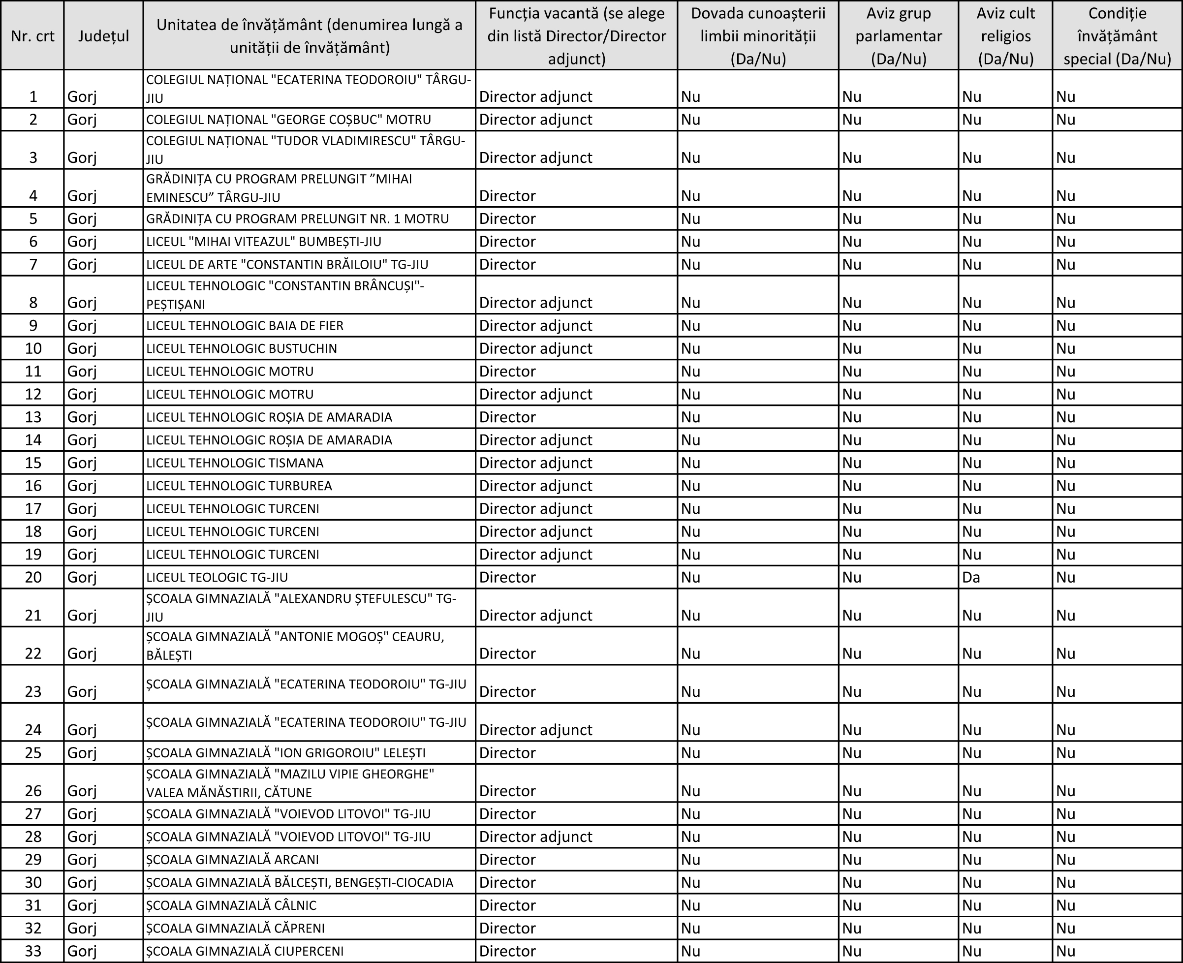 Mai sunt vacante posturi de directori la liceele din Bumbești-Jiu, Peștișani, Baia de Fier, Bustuchin, Motru, Roșia de Amaradia, Tismana, Turburea și Turceni.