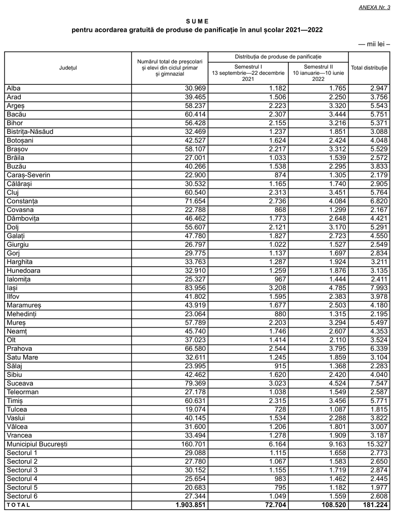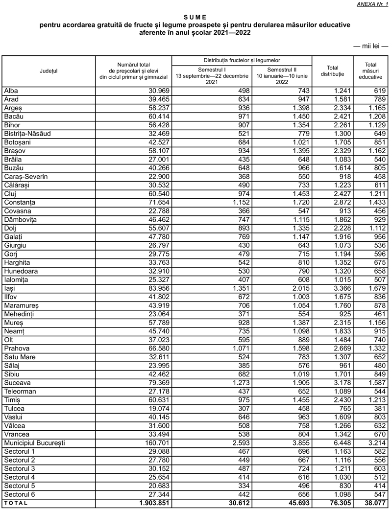 Potrivit documentului, pentru acordarea gratuită de fructe și legume proaspete și pentru derularea măsurilor educative aferente în anul școlar 2021-2022, județului Gorj i-a fost alocată suma totală de 1.194.000 lei (semestrul I – 479.000 lei, semestrul II – 715.000 lei), plus 596.000 lei pentru măsurile educative.