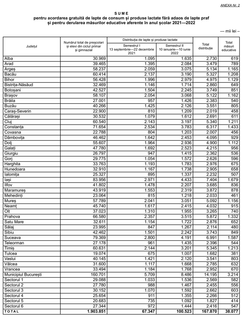 Reamintim că valoarea totală a programului pentru şcoli al României în anul şcolar 2021-2022 este de 501.553.278 lei (101.734.944,8 euro), din care: 76.304.796 lei pentru acordarea gratuită de fructe şi legume şi 38.077.020 lei pentru derularea măsurilor educative aferente; 181.223.891 lei pentru acordarea gratuită de produse de panificație; 167.870.551 lei pentru acordarea gratuită de lapte de consum şi produse lactate fără adaos de lapte praf şi 38.077.020 lei pentru derularea măsurilor educative aferente.