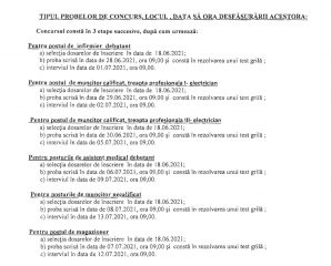 Spitalul Județean de Urgență Târgu Jiu face noi angajări! În total, 8 posturi au fost scoase la concurs: 2 posturi de asistent medical debutant generalist, unul de infirmier debutant, unul de magazioner, două posturi de electricieni și alte două de muncitori necalificați.