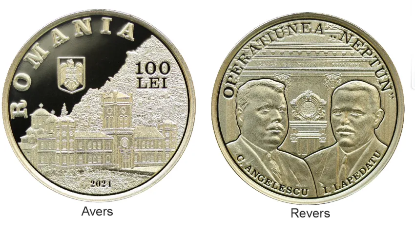 Reversul monedei redă portretele și numele lui Constantin Angelescu și Ion Lapedatu, guvernatori ai BNR, Palatul Vechi al Băncii Naționale a României în fundal și inscripția «OPERATIUNEA ,,NEPTUN”».