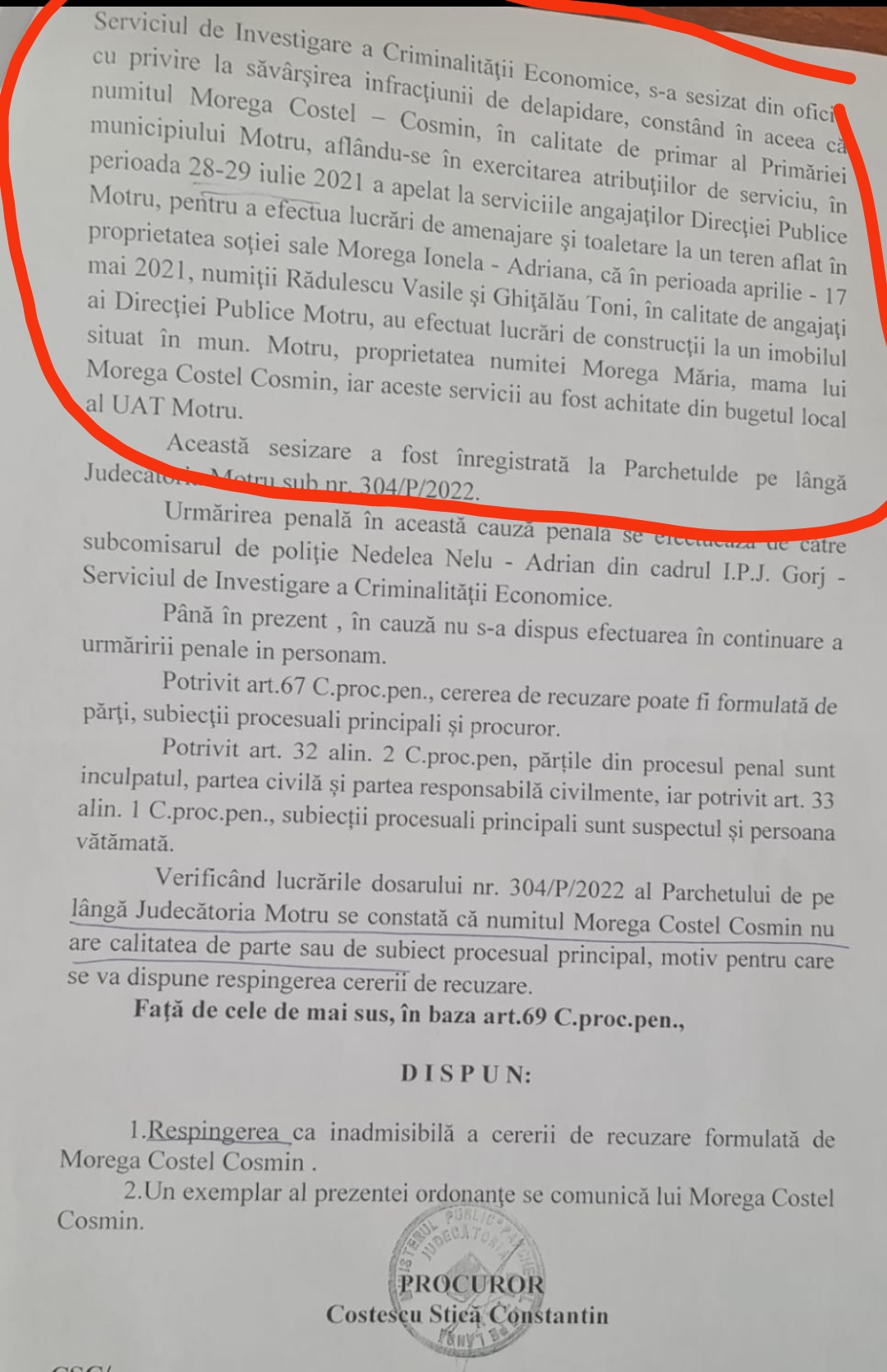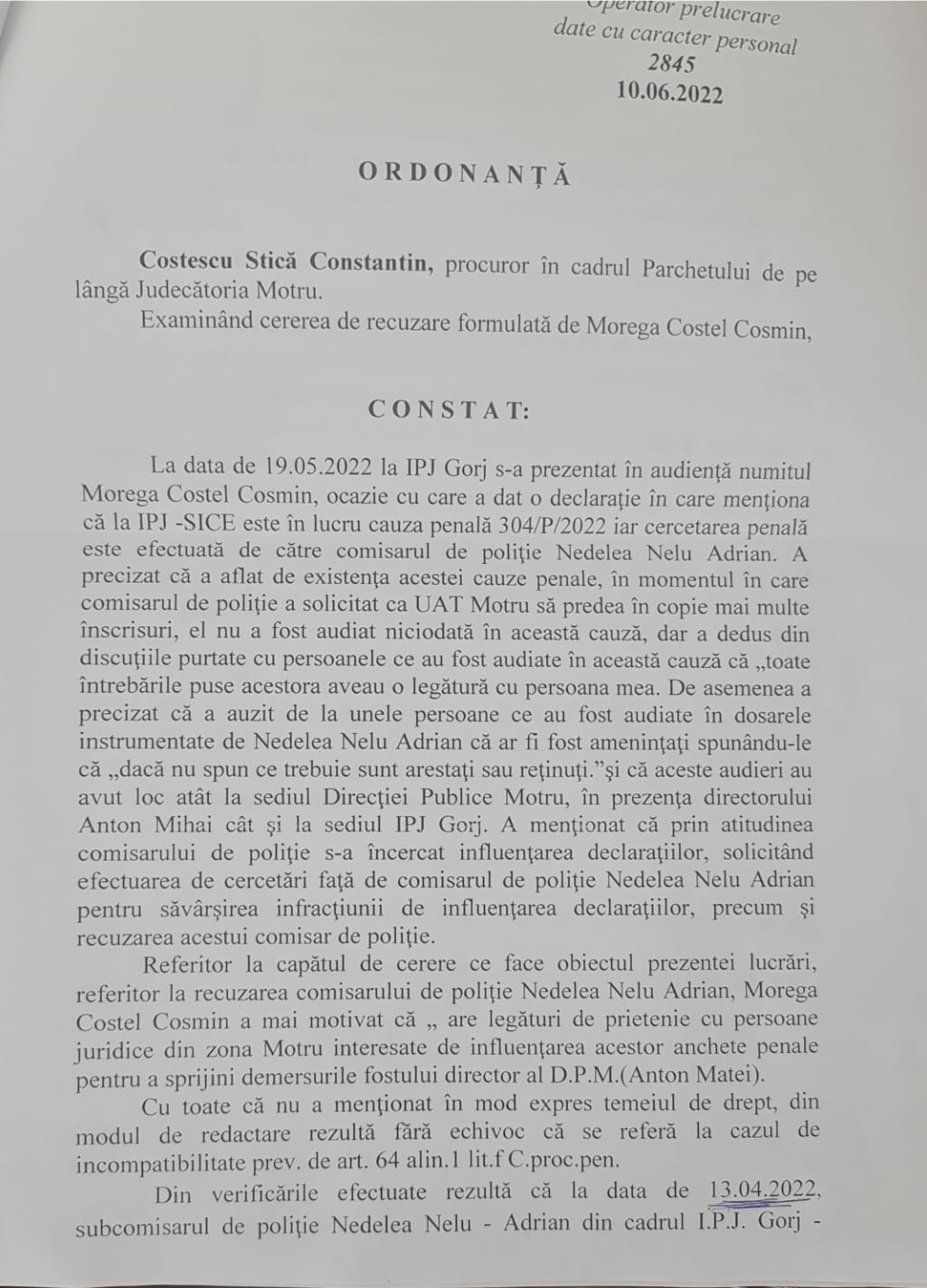 Primarul Morega aflând ce i se pregătește, muncitorii vorbind ca și mulți alți cetățeni care au aflat că primarul va fi reținut, se adresează pe 29 mai 2022 Parchetului de pe lângă Judecătoria Motru, care instrumentează dosarul cu pricina, și cere recuzarea polițistului Nedelea din acesta. Primarul își motivează clar cererea, apropiere polițistului de persoane influente din oraș și de Dan Matei, dar primește un răspuns pe 10 iunie de la PJ Motru că polițistul nu poate fi recuzat pe motiv că Morega nu e parte din dosarul respectiv.