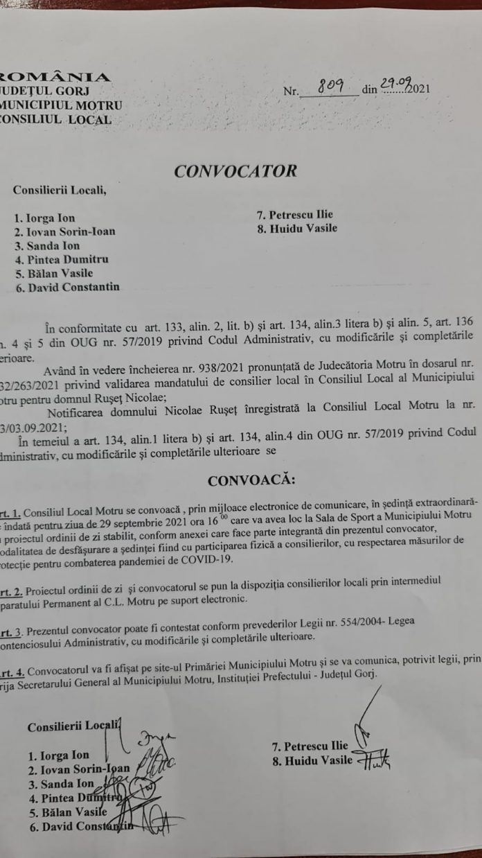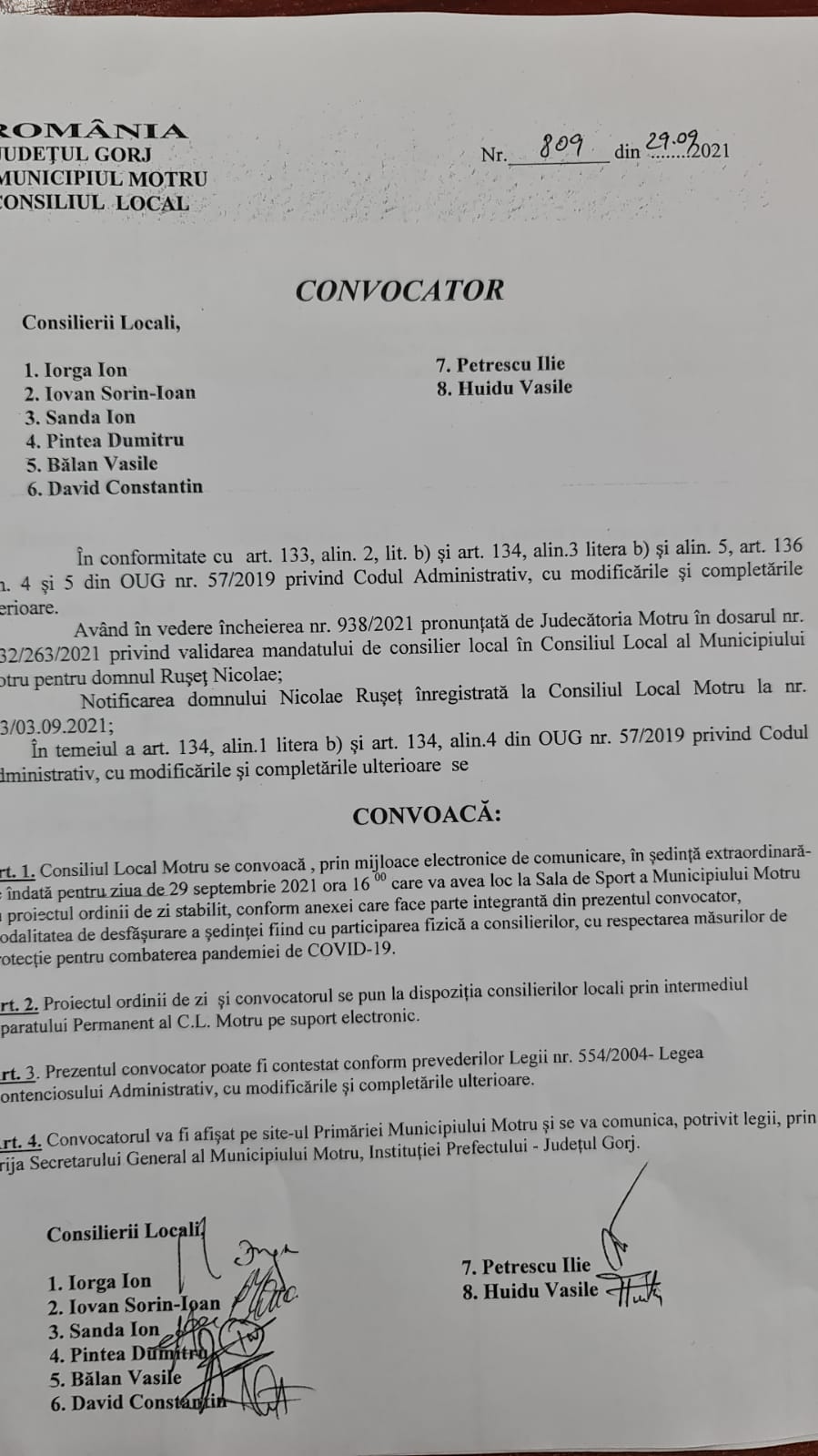 Astăzi, la ora 16.00, se încearcă organizarea a celei de-a 7-a ședințe de CL Motru, cu scopul validării consilierului liber Nicolae Rușet. Ieri a fost ședință de îndată, care, deși nu respectă legatitatea(adică urgență poate fi stabilită doar de primar), tot a eșuat, fiind prezenți la aceasta doar 7 consilieri.