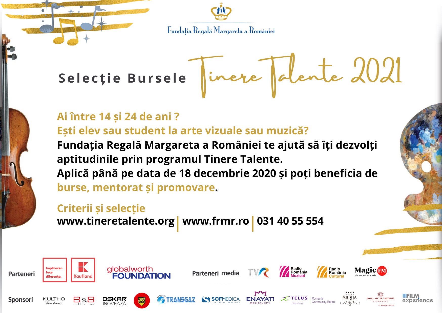 Selecția națională pentru bursierii anului 2021 este deschisă către elevi și studenți de la liceele și universitățile de muzică și arte din toată țara, cu vârste cuprinse între 14 și 24 de ani. Selecția are loc în două etape, care presupun inițial evaluarea dosarului candidaților în luna decembrie, apoi evaluarea artistică, realizată în luna ianuarie de către un prestigios juriu de specialitate compus din personalități din lumea artei. Dosarul complet se trimite până la data de 18 decembrie 2020, la adresa de e-mail: tineretalente@principesa.ro, iar rezultatele vor fi anunțate în februarie 2021. Detalii despre criteriile de eligibilitate și metoda de aplicare se regăsesc pe site-ul www.tineretalente.org. Programul național ,,Tinere Talente” a debutat în anul 2008 cu scopul de a sprijini și promova tinerii artiști talentați care provin din familii modeste și care au nevoie de sprijin financiar pentru a-și atinge adevăratul potențial și a-și exprima talentul. Ceea ce diferențiază programul Tinere Talente de alte proiecte care oferă burse este abordarea holistică, centrată pe dezvoltarea și afirmarea acestor artiști în devenire, nu numai pe sprijin financiar. Pe lângă burse, tinerii primesc îndrumarea unor mentori valoroși, pregătire prin masterclassuri și au oportunități de promovare foarte importante. În 13 ani, prin acest program au fost acordate 350 de burse de studiu, au fost organizate 450 de recitaluri, concerte și expoziții, asigurate 140 de masterclass-uri naționale și internaționale și cucerite 175 de premii la concursuri naționale și internaționale. Programul este susținut de parteneri și sponsori, dar și prin donații individuale colectate prin SMS la 8864 cu textul ARTĂ, prin care publicul poate dona 4 Euro lunar în cadrul campaniei România are nevoie de artă. Fundaţia Regală Margareta a României a fost înfiinţată în 1990 de către Regele Mihai I al României și Majestatea Sa Margareta, Custodele Coroanei române. Cu o activitate de peste 30 de ani, Fundația Regală Margareta a României sprijină copii, tineri și vârstnici prin intervenții durabile, bazate pe schimbul de experiență și valori între generații. De-a lungul timpului, Fundația s-a implicat în numeroase proiecte sociale, culturale şi de susținere a educației şi talentului artistic. Mai multe detalii despre programele Fundaţiei sunt disponibile pe www.frmr.ro