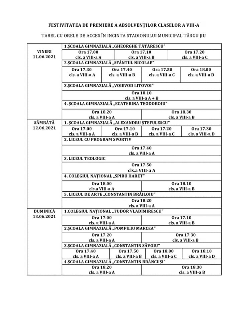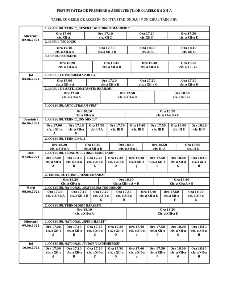 Absolvenții învățământului gimnazial, liceal și postliceal din Târgu Jiu vor fi premiați în cadrul unor ceremonii organizate, începând de săptămâna viitoare, la Stadionul Municipal. ”Vă prezint programul evenimentelor și trebuie menționat faptul că vor fi respectate toate măsurile impuse de legislație în contextul pandemiei. Am luat legătura cu directorii unităților de învățământ, dar și cu reprezentanții instituțiilor care vor monitoriza evenimentele, în așa fel încât să nu existe niciun fel de probleme. Intenția noastră este aceea de a oferi tinerilor absolvenți posibilitatea de a participa la o ceremonie dedicată lor, de a rămâne cu o amintire frumoasă chiar și în aceste perioade dificile, când ne sunt impuse măsuri restrictive. În perioada 2-13 iunie, vor debuta aceste festivități respectând, bineînțeles, condițiile impuse de lege. Au fost stabilite toate detaliile, iar în cazul în care vremea va fi nefavorabilă, avem la dispoziție Sala Sporturilor, acolo unde pot fi mutate evenimentele, păstrând, totodată, numărul de spectatori impus de instituțiile abilitate”, a anunțat primarul municipiului Târgu-Jiu, Marcel Romanescu.