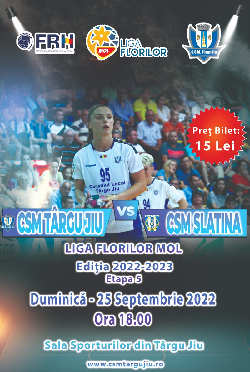Handbalistele de la CSM Târgu Jiu vor juca duminică, 25 septembrie. Partida cu CSM Slatina din Liga Florilor se va disputa începând cu ora 18.00. Având în vedere cererea mare de bilete, tichetele au fost deja puse în vânzare de către reprezentanții clubului gorjean. Acestea pot fi achiziționate de la sediul CSM Târgu Jiu (b-dul Constantin Brâncuși, nr 6), marți și joi între, orele 08.00 – 17.00, miercuri, între orele 08.00-16.00, și vineri, între orele 08.00-14.00. De asemenea, duminică, începând cu ora 17.00, biletele vor fi puse în vânzare și la Sala Sporturilor. Prețul este de 15 lei. Copiii cu vârsta de până la 18 ani au acces gratuit, în limita locurilor disponibile, în baza certificatului de naștere (copie), a carnetului de elev sau a cărții de identitate. CSM are o victorie și trei înfrângeri în Liga Florilor.