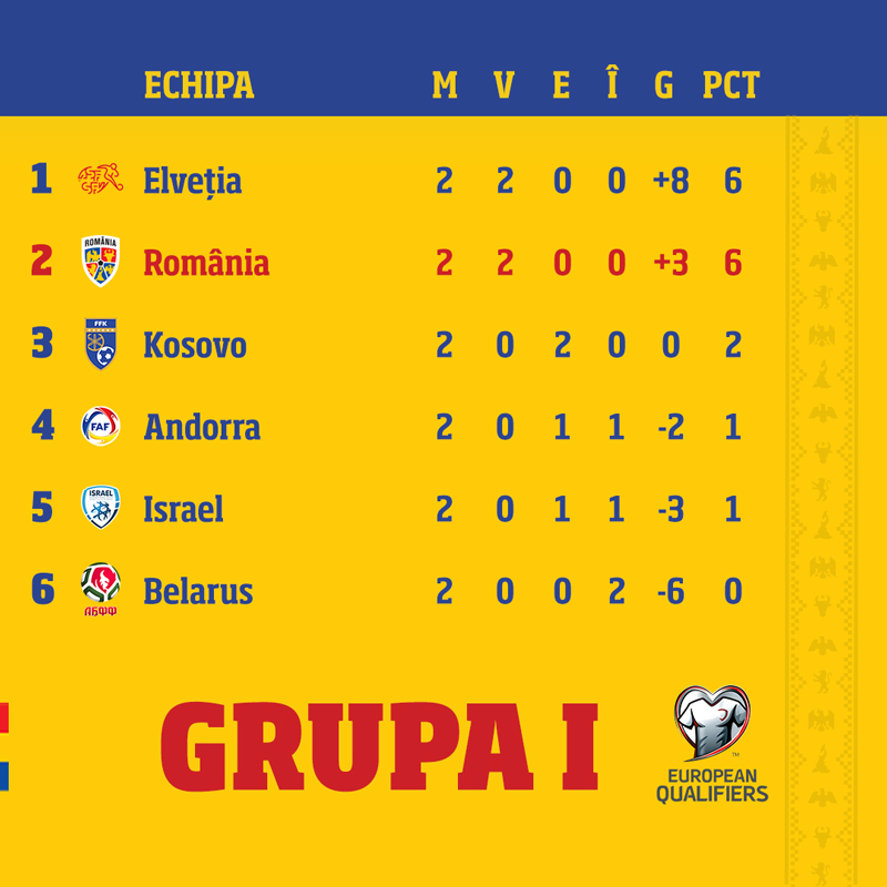 Naționala de fotbal a României a obținut șase puncte din meciurile cu Andorra și Belarus. Trupa lui Edward Iordănescu a trecut cu 2-1 de formația lui Georgi Kondratiev, după un meci pe care l-a controlat, dar la finalul căruia a tremurat. Nicolae Stanciu (17) și Andrei Burcă (19) au oferit un avantaj consistent tricolorilor înainte de pauză, iar Denis Alibec a lovit transversala în startul reprizei secunde. Treptat, amfitrionii au pierdut din consistență la mijlocul terenului și au devenit apatici, lucru care aproape i-a costat. Morozov a redus din diferență în minutul 86, iar Belarus a presat cu toate liniile în prelungiri. Din fericire, vizitatorii nu au avut puterea să egaleze. Nu a fost singura veste bună a serii. În celelalte meciuri ale grupei, Kosovo a remizat cu Andorra (1-1), iar Elveția a bătut-o pe Israel (3-0).