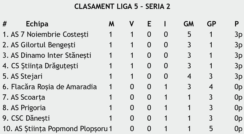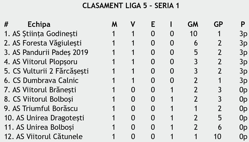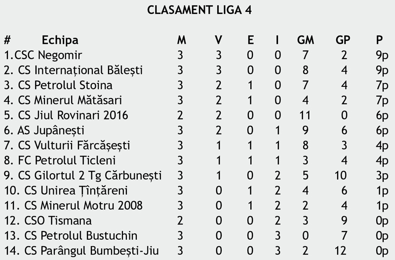 Două echipe au punctaj maxim după primele trei runde din Liga 4. CSC Negomir și CS Internațional Bălești au obținut succese importante în această etapă și se mențin pe podium, acolo unde va ajunge și Jiul Rovinari. Băieții lui Ion Lițoiu vor câștiga la masa verde partida cu Tismana, deoarece gazdele nu au mai intrat pe teren din cauza unor probleme organizatorice. A început și Liga 5 în Gorj. Şi în acest sezon, campionatul va avea două serii. Cel puțin 3 goluri pe meci s-au consemnat la ,,Onoare”, performera rundei inaugurale fiind Știința Godinești, care a marcat de 10 ori în meciul cu Viitorul Cătunele.