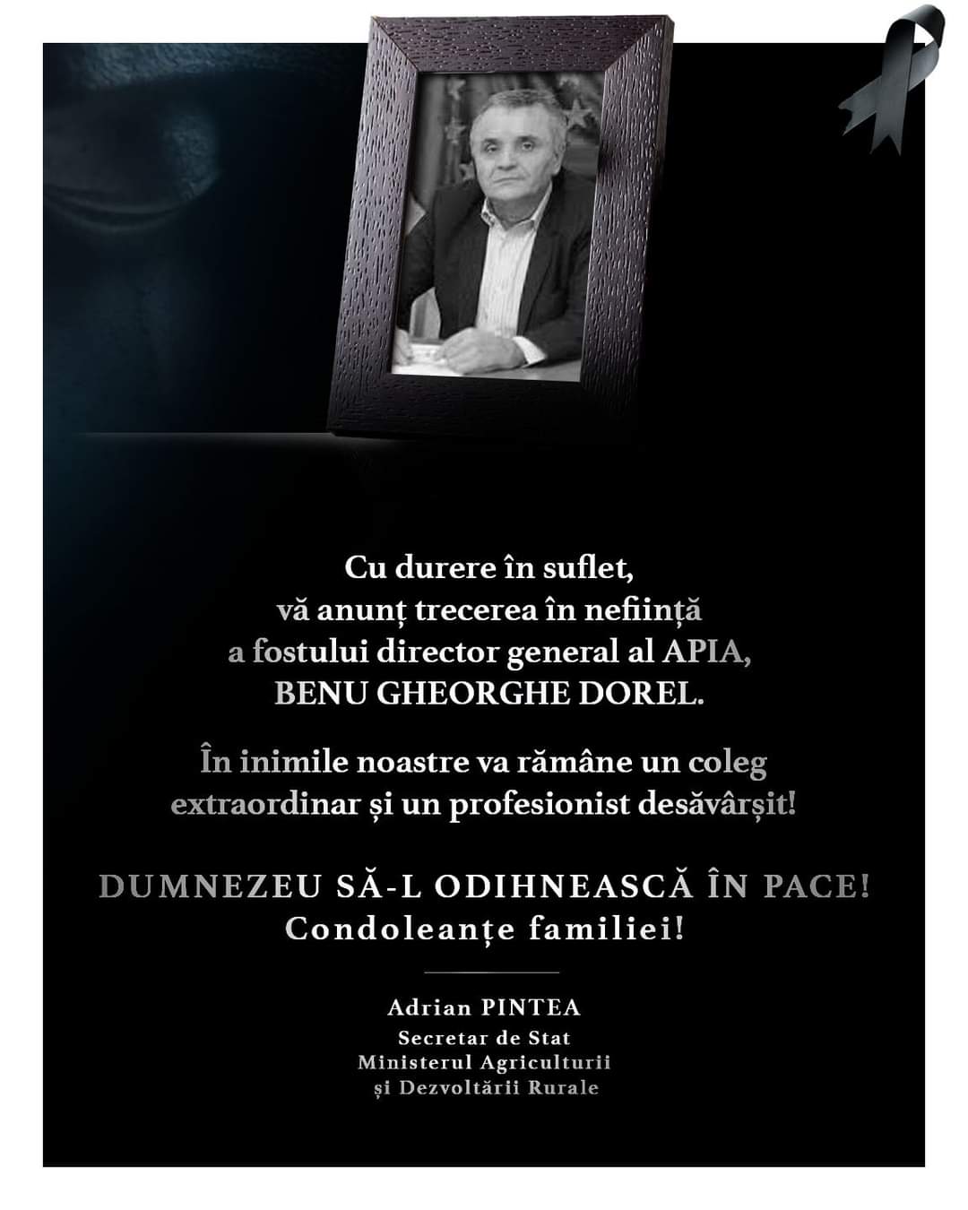 „Cu durere în suflet, vă anunț trecerea în neființă a fostului director general al APIA, BENU GHEORGHE DOREL. În inimile noastre va rămâne un coleg extraordinar și un profesionist desăvârșit! Dumnezeu să-l odihnească în pace! Condoleanțe familiei!”, a transmis secretarul de stat Adrian Pintea.