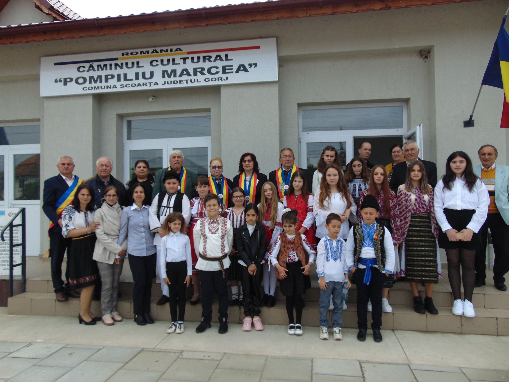 În încheiere, am făcut cu toții o fotografie de grup în fața Căminului Cultural „Pompiliu Marcea”, spre amintire.