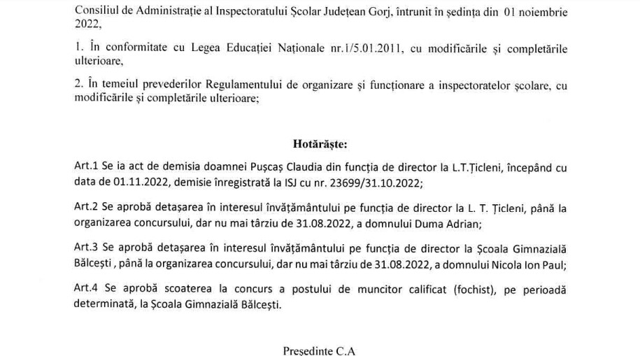 De asemenea, șefii ISJ Gorj au luat act de demisia directoarei Liceului Tehnologic Țicleni. Claudia Pușcaș a renunțat la funcție începând cu data de 1 noiembrie. În locul acesteia a fost numit profesorul Adrian Duma, prin detașare în interesul învățământului, până la organizarea concursului, dar nu mai târziu de data de 31 august 2023.