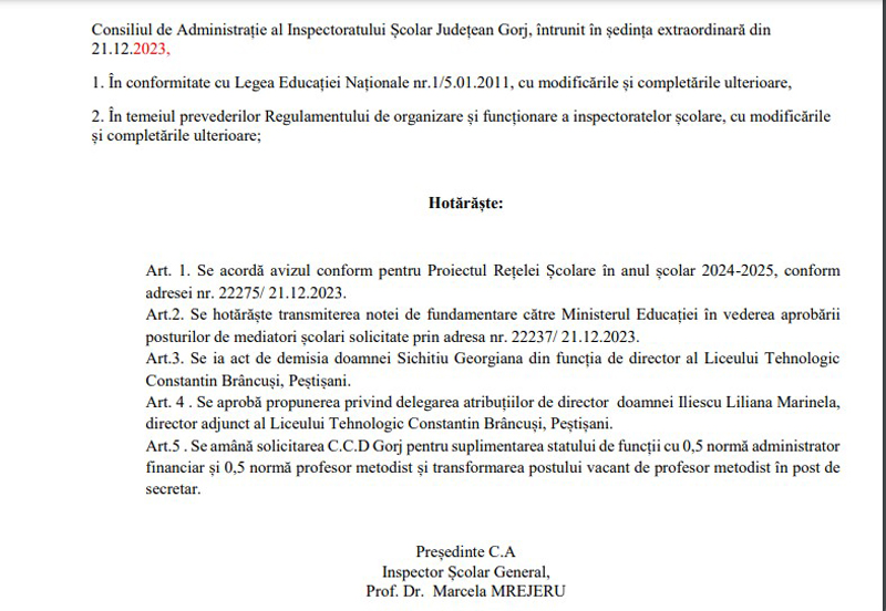Noi demisii în învățământul gorjean. Directoarea liceului din Peștișani a renunțat la funcție, înainte de Crăciun, atribuțiile fiind preluate de directorul adjunct. Astfel, Consiliul de Administrație al Inspectoratului Școlar Județean Gorj a luat act, în ședința din 21 decembrie 2023, de demisia profesoarei Georgiana Sichitiu din funcția de director al Liceului Tehnologic „Constantin Brâncuși” Peștișani.