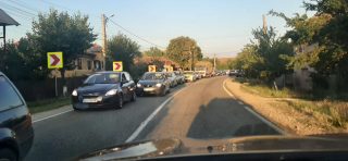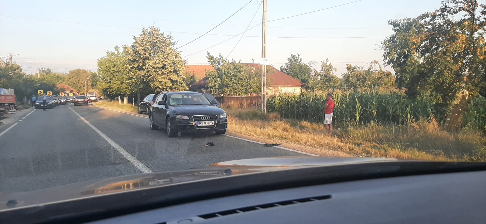 Coada de mașini se întinde pe câțiva kilometri. Interesat este că mașina care a lovit pietonul se afla pe contrasens.