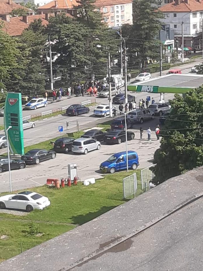 Un eveniment rutier a avut loc în urmă cu scurt timp în zona mol. O mașină este avariată. Un echipaj de poliție se afla la fața locului, iar trecătorii s-au oprit să vadă cum se anchetează accidentul rutier.