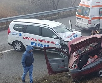 Conducătorul unui autoturism Logan, care circula cu viteză, a derapat într-o curbă și s-a oprit într-o maşină de asistență medicală BGS. Ambii şoferi au fost transportați la spital.