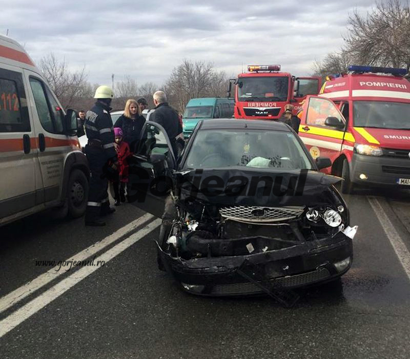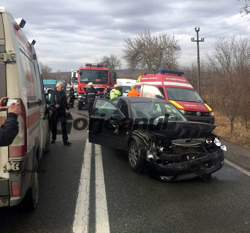 Patru persoane au ajuns, ieri, la spital, în urma unui grav accident, care a avut loc pe Drumul Național 67, la intrarea în localitatea Pișteștii din Deal. În total, trei mașini au fost implicate. Vinovat a fost găsit de polițiști un tânăr de 35 de ani, din comuna Bengești-Ciocadia, care nu ar fi observat că două mașini, aflate în fața sa, au redus viteza, întrucât un alt șofer efectua virajul la stânga și a intrat în coliziune cu ambele autovehicule. Printre cele două victime s-au aflat și două minore de 6 și 16 ani.