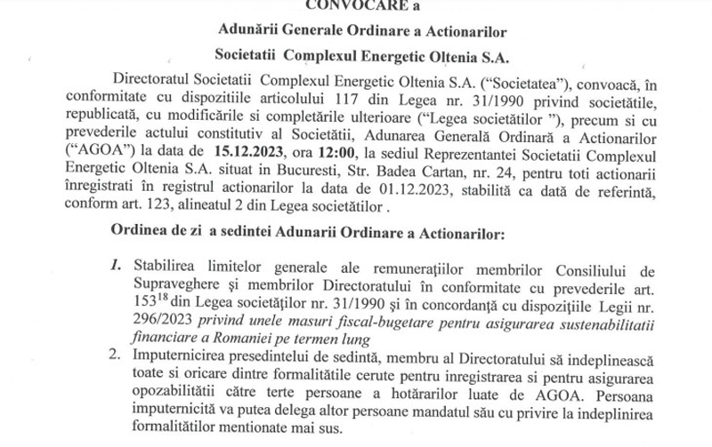 Despre noua organigramă la care lucrează administrația companiei încă nu se cunoaște nimic, însă vor dispărea birouri, servicii și chiar direcții. Potrivit responsabililor din CE Oltenia, șefii companiei nu vor mai putea fi plătiți cu o remunerație egală cu de șase ori salariul mediu/ramură, ci cu de trei ori salariul mediu pe ramură. De asemenea, vor dispărea și funcțiile de șef de birou, mai ales că, în cele mai multe birouri din CEO sunt doar doi oameni, sau niciunul, fiind un singur post și acela de șef. Astfel, ,,din CE Oltenia vor dispărea birouri, chiar și servicii, dacă acestea nu au mai mult de 10 salariați, direcții care nu au mai mult de 20 de salariați, dar și direcțiile generale, care, chiar dacă nu se numesc așa în CEO, sunt similare acestora, și ar trebui să aibă peste 30 de salariați. Mai mult, și aici vine partea dureroasă pentru cei peste 9.000 de salariați ai Complexului Energetic Oltenia, salariile lor trebuie ajustate, în așa fel încât să reprezinte 80% din salariul celor din Directoratul CEO, înjumătățit în urma măsurilor impuse de Guvern”, spuneau sursele citate prin luna octombrie a acestui an, după ce măsurile fiscale au fost adoptate de Guvern. Iată că, în ședința acționarilor din 15 decembrie, acționarii vor aproba noile indemnizații pentru cei din CS și Directoratul CEO, fiind singurul punct de pe ordinea de zi, în afara celui care prevede că această măsură va fi dusă la îndeplinire de cei îndrituiți.
