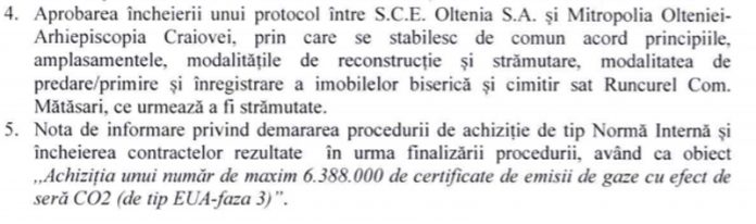 De asemenea, pentru Complexul Energetic Oltenia acţionarii vor aproba şi protocolul încheiat cu Mitropolia Olteniei pentru strămutarea lăcaşurilor de cult şi a reconstruirii lor. Este vorba despre satul Runcurel, acolo unde trăiesc în jur de 100 de familii care nu au primit nicio despăgubire din partea companiei. Planul CEO este să strămute biserica şi cimitirul. Localnicii din Runcurel sunt izolaţi de restul lumii, neavând acces la apă sau la magazine. Ei aşteaptă şi acum despăgubirile de la CE Oltenia, pentru terenurile şi casele distruse de lucrările miniere. Numai că banii pentru aceștia nu au mai fost alocați.