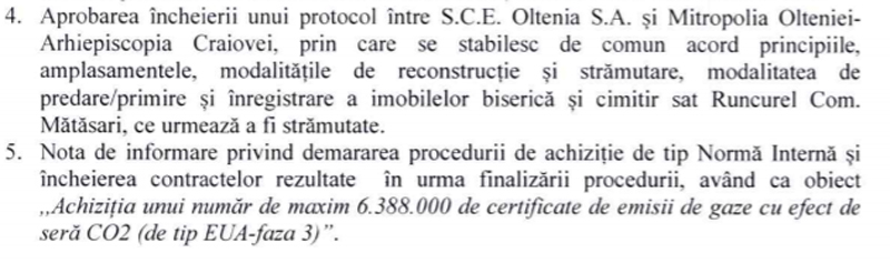 Complexul Energetic Oltenia a demarat procedura de achiziție a 6,3 milioane de certificate de carbon. O notă în acest sens va fi prezentată în ședința AGEA din 24 mai. Compania a primit de la stat un ajutor financiar în valoare de peste 600 de milioane de lei, încadrându-se în termenul de conformare. Preţul unui certificat CO2 a ajuns la 46 de euro.