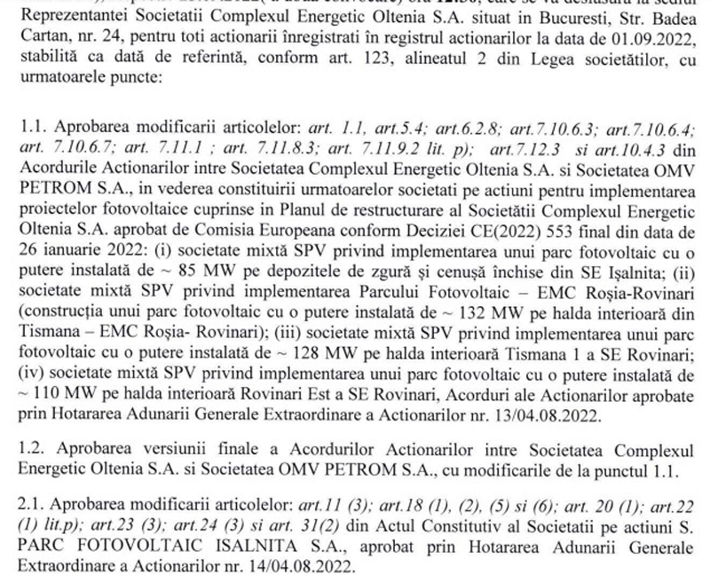 Acționarii Complexului Energetic Oltenia se vor întâlni într-o ședință AGEA pentru a aproba acordurile finale cu OMV Petrom, pentru parcurile fotovoltaice, având acorduri de asociere și cu Tinmar Energy, în vederea constituirii societăților mixte sub care vor funcționa și grupuri pe gaz.
