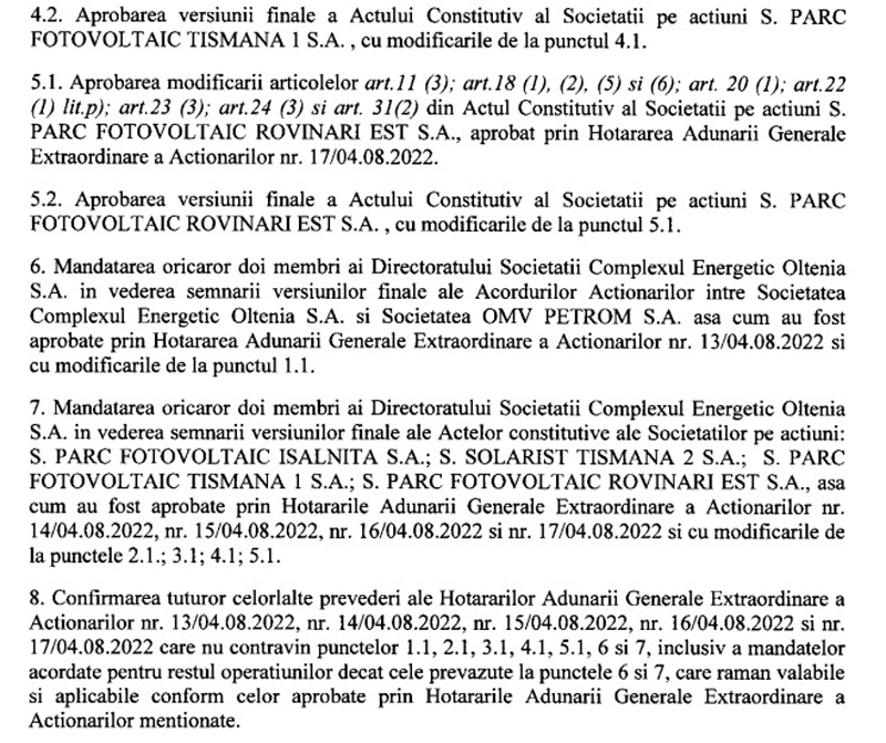 Societățile mixte se vor numi: Parc fotovoltaic Ișalnița SA, Solaris Tismana 2 SA, Parc fotovoltaic Tismana I, Parc fotovoltaic Rovinari Est SA. AGEA se va întru pe 22 septembrie iar doi membri ai Directoratului CEO vor semna acordurile finale.