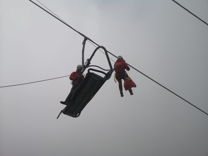 În aceste momente salvamontiștii gorjeni efectuează exercițiul de salvare din telescaunul de la Rânca, condiție obligatorie pentru avizarea funcționarii instalației.
