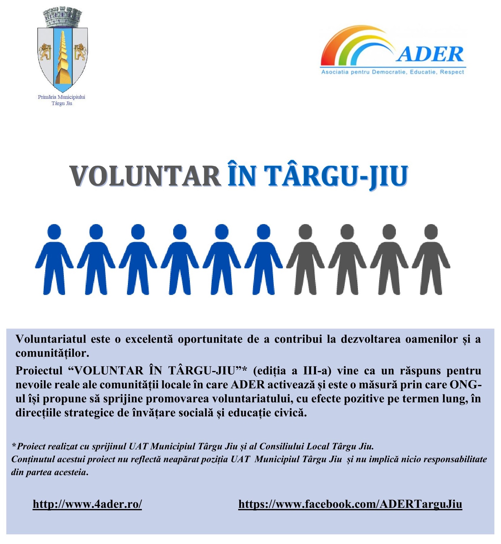 „Prin intermediul proiectului „Voluntar în Târgu Jiu”, ADER dorește să contribuie la creșterea capitalului social și să sprijine tinerii în implicarea activă în dezvoltarea comunității locale”, a delcarat Ștefan Ghimiși, președinte ADER. Proiectul este realizat cu sprijinul UAT Municipiul Târgu Jiu și al Consiliului Local Târgu Jiu.