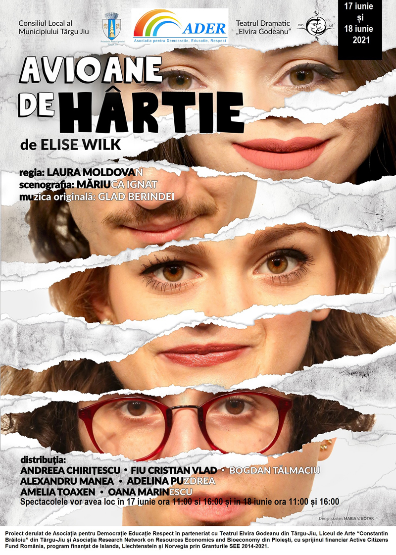 În cadrul proiectului ,,Pasivitatea nu oprește bullying-ul!”, Teatrul Dramatic ,,Elvira Godeanu” din Târgu-Jiu și Asociația pentru Democrație, Educație, Respect, organizează un număr de patru spectacole cu piesa ,,Avioane de hârtie”. Spectacolele se vor desfășura în zilele de 17 și 18 iunie, la orele 11.00 și 16.00, fiind dedicate tuturor elevilor din județul Gorj. Intrarea este liberă, în funcție de înscrierile făcute și capacitatea sălii. Proiectul ..Pasivitatea nu oprește bullying-ul!” este derulat de Asociația pentru Democrație, Educație, Respect, în parteneriat cu Teatrul ..Elvira Godeanu” din Târgu-Jiu, Liceul de Arte ..Constantin Brăiloiu” din Târgu-Jiu și Asociația Research Network on Resources Economics and Bioeconomy din Ploiești, cu sprijinul financiar Active Citizens Fund România, program finanțat de Islanda, Liechtenstein și Norvegia prin Granturile SEE 2014-2021.