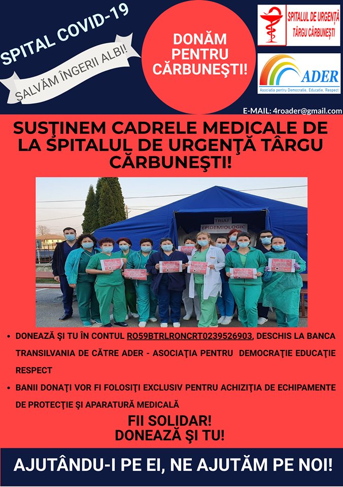 Asociaţia pentru Democraţie Educaţie Respect (ADER) se implică în lupta împotriva COVID-19, și a lansat o campanie de strângere de fonduri ce vor fi donate autorităților medicale de la Spitalul de Urgenţă Târgu Cărbuneşti – Spital COVID -19, pentru a ajuta personalul medical din prima linie. Banii donaţi vor fi folosiţi exclusiv pentru achiziţia de echipamente de protecţie şi aparatură medicală. Persoană de contact: Popescu Oana – 0765818133; E-mail: 4roader@gmail.com.